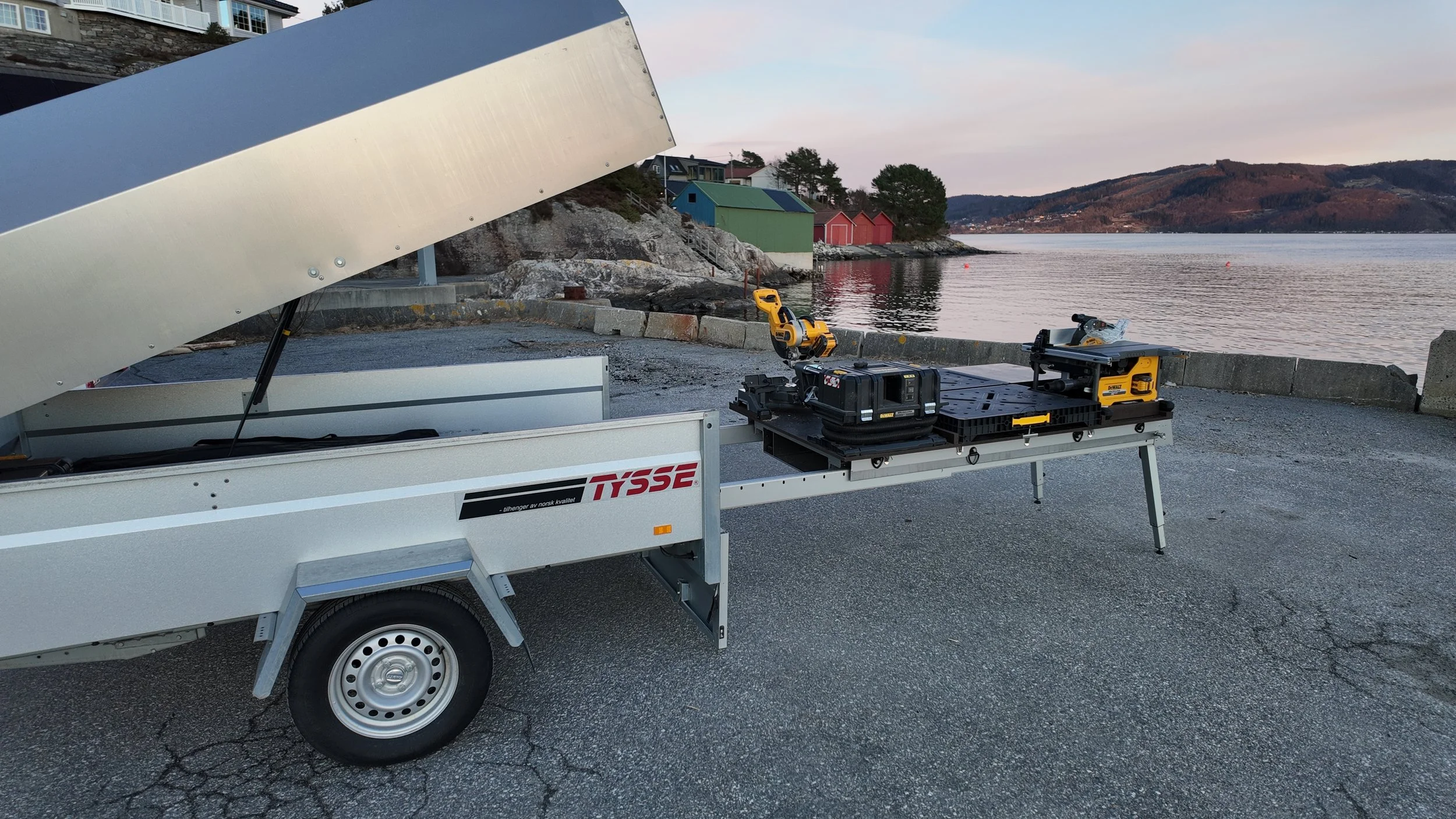 Modulen kan løftes av i sin helhet, også med sagbordet montert, og plasseres i bilen. I dette eksempelet har vi valgt å bygge sagbordet i samme bredde som tilhengeren, noe som gjør det for bredt for lasteplanet i vår bil. Dette er likevel et bevisst valg du selv kan ta stilling til, dersom du ønsker å kunne flytte løsningen mellom bil og tilhenger.